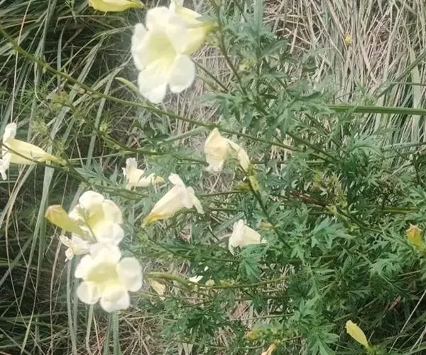 黄花角蒿(变种)为紫葳科年生至多年生草本植物,具分枝的茎,高达80厘米,根近木质而分枝。生于海拔2000-2600米山坡。高山花卉,花淡黄色,钟状漏斗形,具有较好的观赏性。此外,同属植物黄波罗花之别名亦称黄花角蒿。