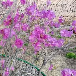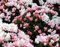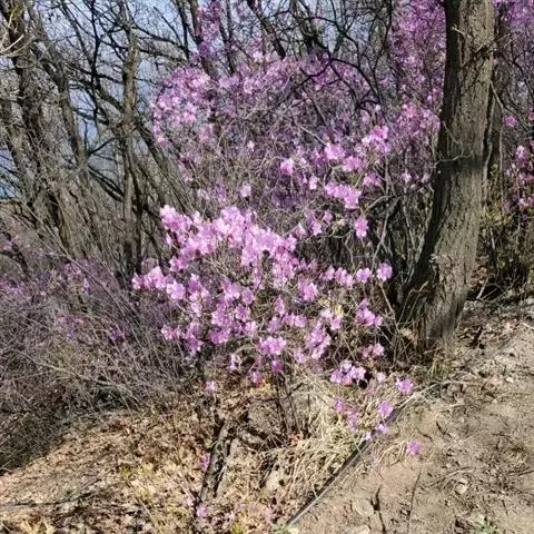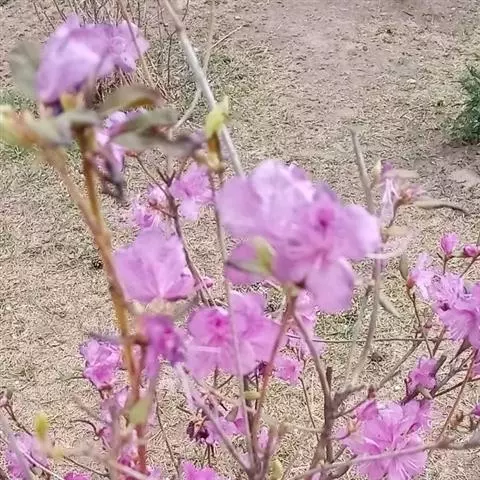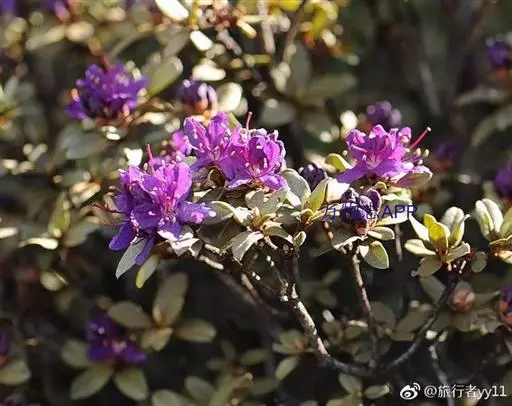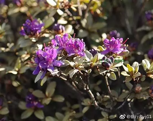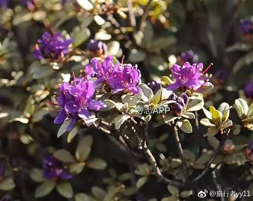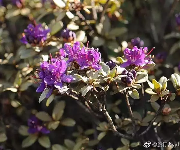 灰背杜鹃(学名:Rhododendron hippophaeoides Balf. f. et W. W. Smith):常绿小灌木,高0.25-1米。茎直立,幼枝细长,呈扫帚状,黄棕色,密被棕黄褐色鳞片。叶芽鳞脱落。叶散生于幼枝,叶片近革质,长圆形、椭圆形、长圆状披针形至长圆状卵形,上面灰绿色,无光泽,密被淡黄色、邻接的鳞片,下面淡黄灰色,鳞片相同,透明的金黄色至麦秆色。伞形总状,有花4-7朵;花冠宽漏斗状,长1-1.3厘米,鲜玫瑰色、淡紫色至蓝紫色,少有白色。蒴果狭卵形,密被鳞片。花期5-6月,果期10月。
