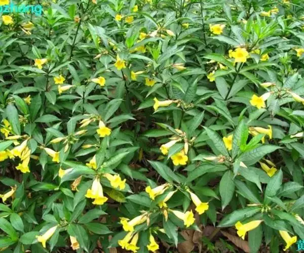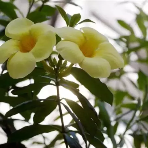 黄蝉(学名:Allemanda neriifolia Hook.):常绿灌木,植株直立生长,高约 2米,盆栽一般控制在1米左右。叶3片至5片轮生,叶片椭圆形或倒披针状矩圆形,叶长5厘米至12厘米,宽1.5厘米至4厘米,被有短柔毛。聚伞花序,花朵金黄色,喉部有橙红色条纹,花冠阔漏斗形,有裂片5 枚,并向左或向右重叠,花冠基部膨大,内部着生雄蕊5枚。蒴果球形,有长刺。 花期5-6月。 原产美国南部及巴西,分布于热带美洲,中国为引入栽培。用于庭园绿化,植株浓密,叶色碧绿,花朵明快灿烂,非常醒目,适宜作大中型盆栽,装饰客厅、阳台、公园及商场、会场等大型室内空间,效果很好。