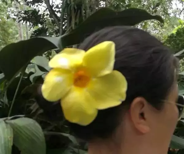 聚伞花序顶生;总花梗和花梗被秕糠状小柔毛;花橙黄色,长4-6厘米,张口直径约4厘米;苞片披针形,着生在花梗的基部;花萼深5裂,裂片披针形,内面基部具少数腺体:花冠漏斗状,内面具红褐色条纹,花冠下部圆筒状,长不超过2厘米,直径2-4毫米,基部膨大,花喉向上扩大成冠檐,长约3厘米,直径约1.5厘米,冠檐顶端5裂,花冠裂片向左覆盖,裂片卵圆形或圆形,先端钝,长1.6-2.0厘米,宽约1.7厘米;雄蕊5枚,着生在花冠筒喉部,花丝短,基部被柔毛,花药卵圆形,顶端钝,部基圆形;花盘肉质全缘,环绕子房基部;子房全缘,1室,花柱丝状,柱头顶端钝,基部环状。