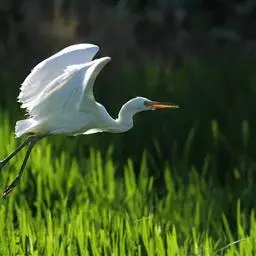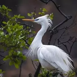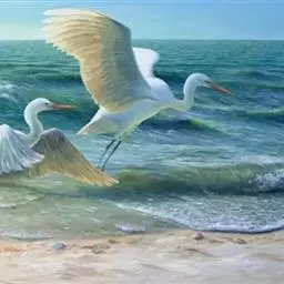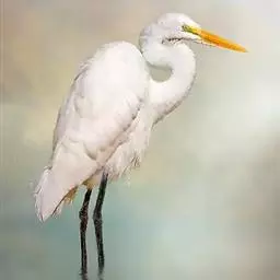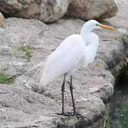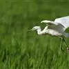 大白鹭 体态纤瘦,乳白色:夏羽的成鸟繁殖时枕部着生两条狭长而软的矛状羽,状若双辫;肩和胸着生蓑羽,冬羽时蓑羽常全部脱落,虹膜黄色;脸的裸露部分黄绿色,嘴黑色,嘴裂处及下嘴基部淡角黄色;胫与脚部黑色,趾呈角黄绿色。通常简称为白鹭。小白鹭场栖息于稻田、沼泽、池塘间,以及海岸浅滩的红树林里。常曲缩一脚于腹下,仅以一脚独立。白天觅食,好食小鱼、蛙、虾及昆虫等。繁殖期3~7月。繁殖时成群,常和其他鹭类在一起,雌雄均参加营巢,次年常到旧巢处重新修葺使用。卵蓝绿色,壳面滑。雌雄共同抱卵。卵23天出雏。