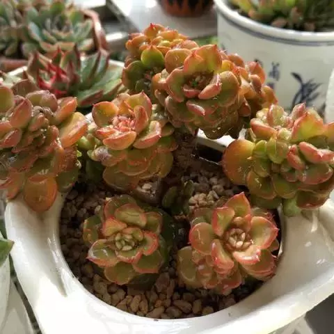 大和锦是景天科拟石莲花属的多肉植物。肉质叶排成紧密的莲座状,广卵形至散三角卵形,背面突起呈龙骨状,…