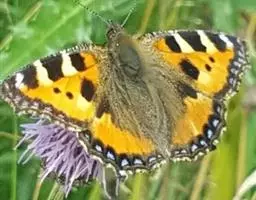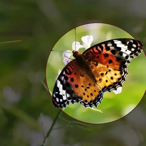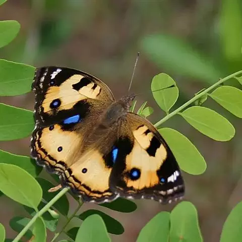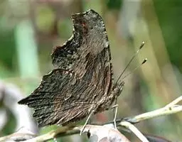 孔雀蛱蝶展翅宽50~60mm。翅膀表面红色,上、下翅有一大型彩色眼纹;翅膀腹面淡褐色,拟似烟熏枯叶…