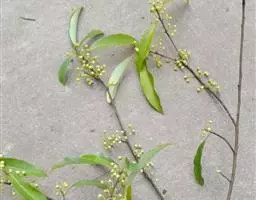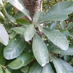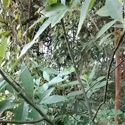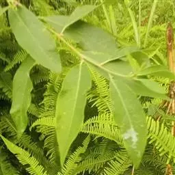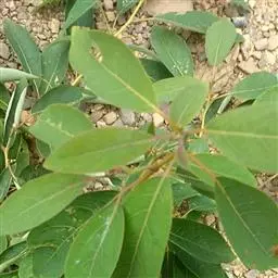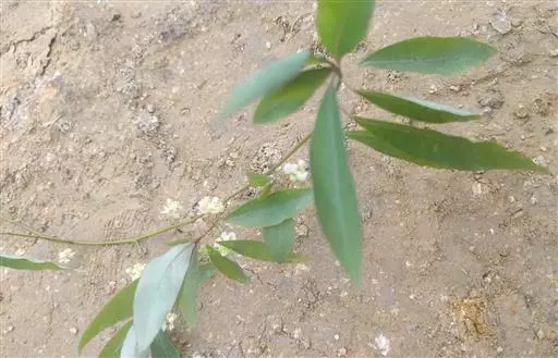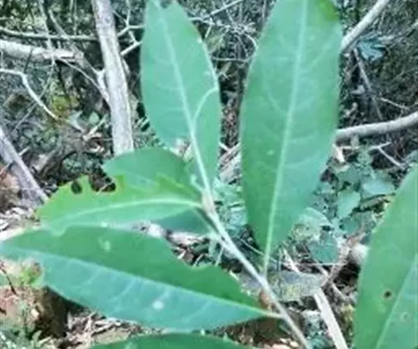 叶互生,纸质,有香气,披针形或长圆状披针形,长7-11厘米,宽1.4-2.4厘米,先端渐尖,基部楔形,全缘,上面深绿色,下面粉绿色,苍白色。两面均无毛,羽状脉,侧脉每边6-10条,纤细,中脉、侧脉在两面均突起;叶柄长6-20毫米,纤细,无毛。