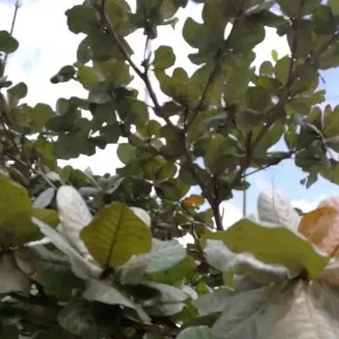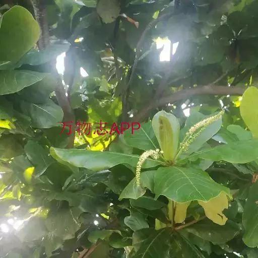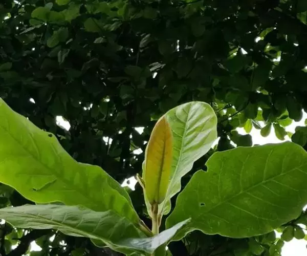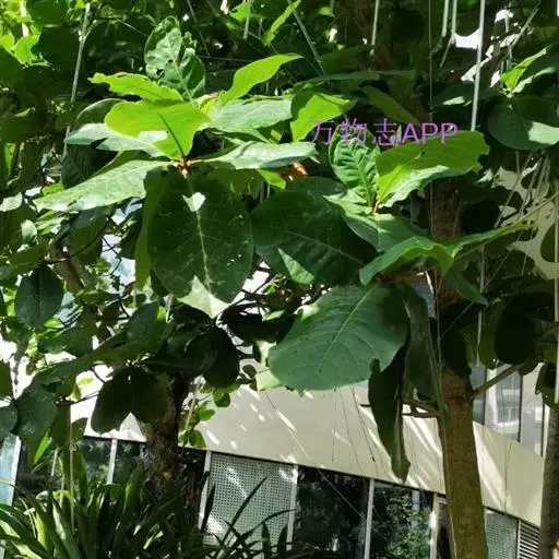大乔木,高15米或更高,树皮褐黑色,纵裂而剥落状;枝平展,近顶部密被棕黄色的绒毛,具密而明显的叶痕。叶大,互生,常密集于枝顶,叶片倒卵形,长12-22厘米,宽8-15厘米,先端钝圆或短尖,中部以下渐狭,基部截形或狭心形,两面无毛或幼时背面疏被软毛,全缘,稀微波状,主脉粗壮,上面下陷而成一浅槽,背面凸起,且于基部近叶柄处被绒毛,侧脉10-12对,网脉稠密;叶柄短而粗壮,长10-15毫米,被毛。