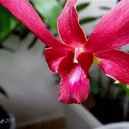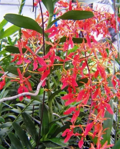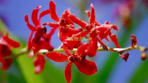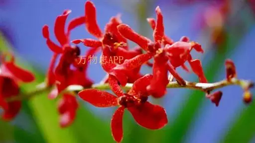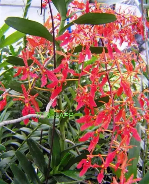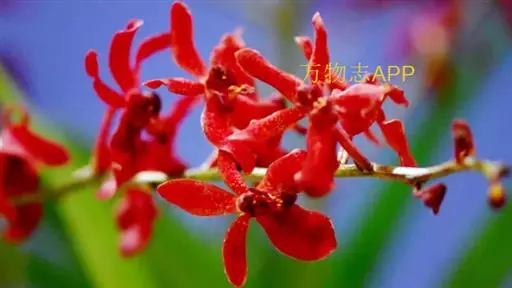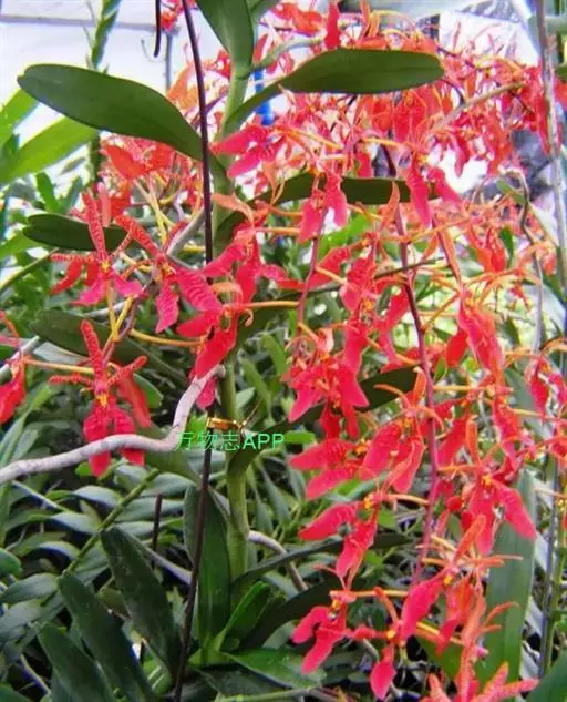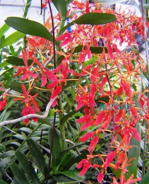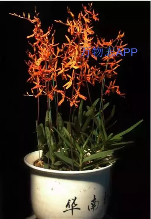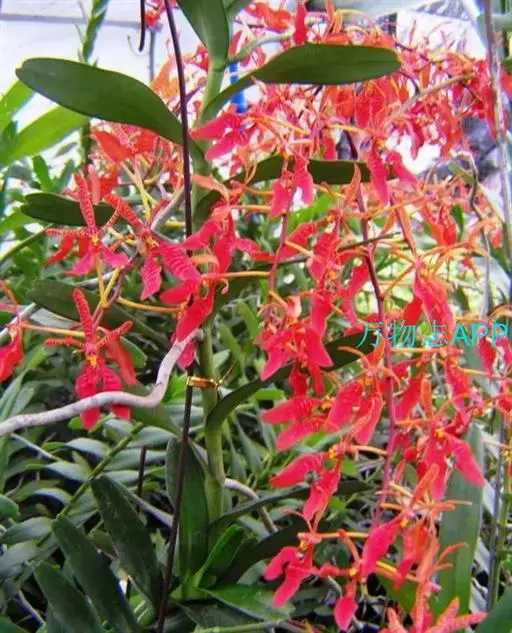 麒麟火焰兰 麒麟火焰兰,株型直立,叶带形、绿色、质硬;花色橙红,带鲜红色的斑点;花葶直径约3.0毫米,长可达43厘米以上,分枝数0—4个,主枝着生花朵数可达16—20朵,总花朵数可达25朵以上,花朵长约5.0厘米、宽约6.0厘米。在广州地区简易大棚栽培2月底到3月初开花,花期长可达2—3个月,表现出较强的耐热性、耐冷性以及抗病性。