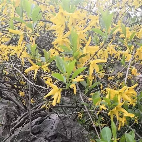 毛连翘(变型)Forsythia suspensa f. pubescens Rehd.:与原变型区别在于该变型的幼枝、叶柄以及叶片上面均被短柔毛,而叶片下面被柔毛或短柔毛,尤以叶脉为密。花期4月。