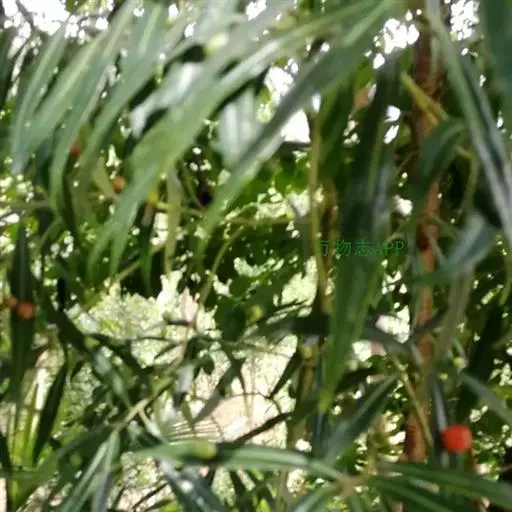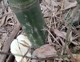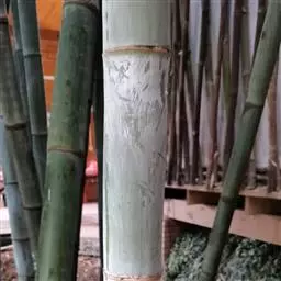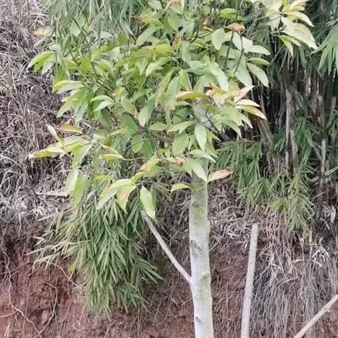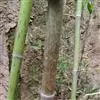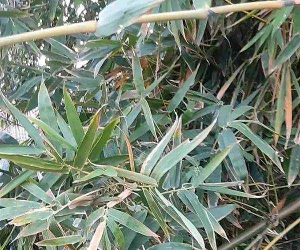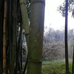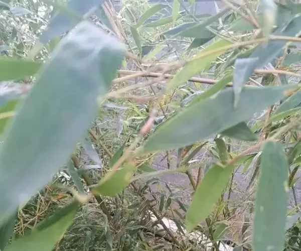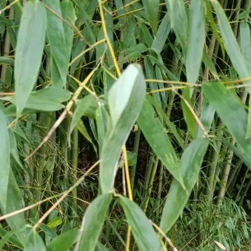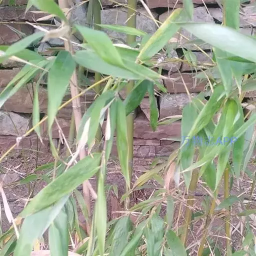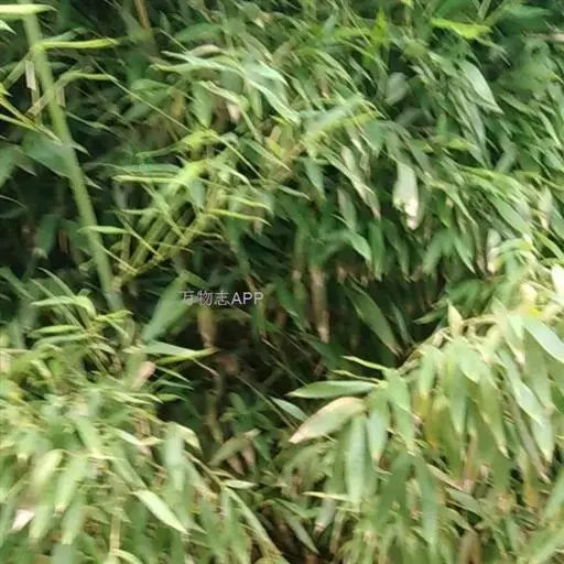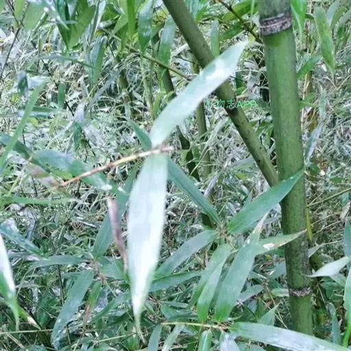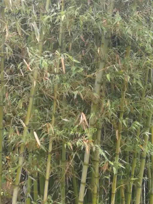 树竿高2— 5米,直径4-10厘米,幼时无毛,微被白粉,绿色,成长的竿呈绿色或黄绿色,在10倍放大镜下可见猪皮状小凹穴或白色晶体状小点;中部节间长20--45厘米,壁厚约5毫米;竿环在较粗大的竿中于不分枝的各节_L不明显;捧环微隆起。捧鞘背面呈乳黄色或绿黄褐色又多少带灰色,有绿色脉纹,无毛,微被白粉,有淡褐色或褐色略呈圆形的斑点及斑块;捧耳及鞘口缝毛俱缺;捧舌绿黄色,拱形或截形,边缘生淡绿色或白色纤毛;捧片狭三角形至带状,外翻,微皱曲,绿色,但具桔黄色边缘。末级小枝有2-5叶;叶鞘几无毛或仅上部有细柔毛;叶耳及鞘口缝毛均发达;叶片长圆状披针形或披针形,长5. 6-13厘米,宽1.1-1. 2厘米。花枝未见。笋期5月中旬。