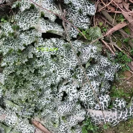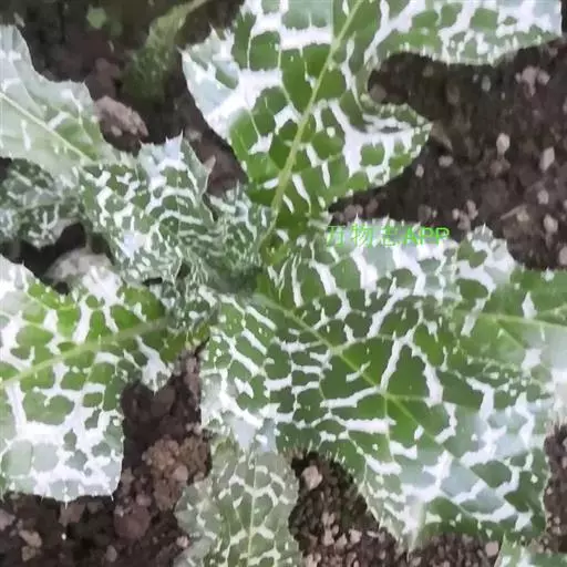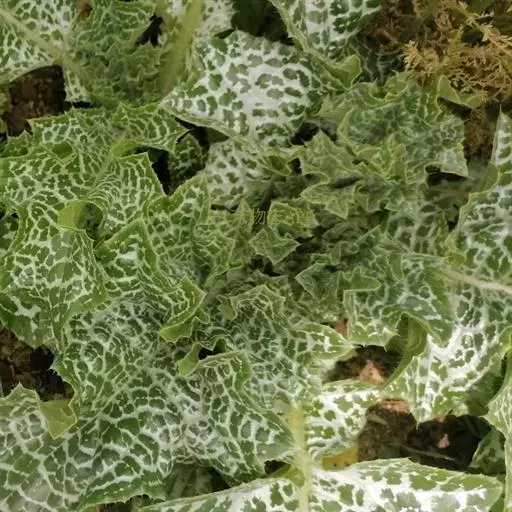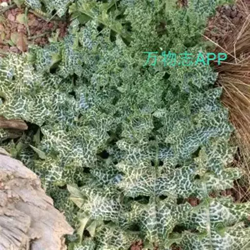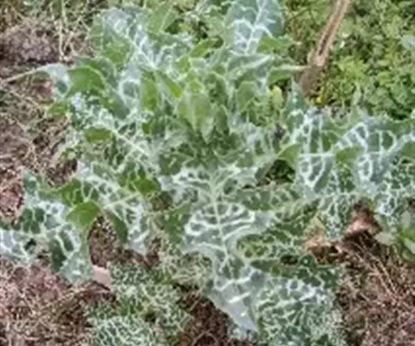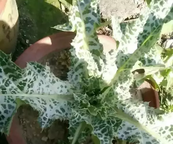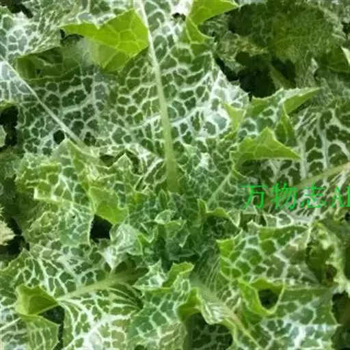 莲座状基生叶与下部茎叶有叶柄,全形椭圆形或倒披针形,长达50厘米,宽达30厘米,羽状浅裂至全裂;中部与上部茎叶渐小,长卵形或披针形,羽状浅裂或边缘浅波状圆齿裂,基部尾状渐尖,基部心形,半抱茎,最上部茎叶更小,不分裂,披针形,基部心形抱茎。全部叶两面同色,绿色,具大型白色花斑,无毛,质地薄,边缘或裂片边缘及顶端有坚硬的黄色的针刺,针刺长达5毫米。