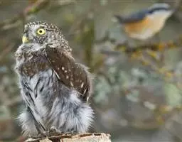 鸺鶹,全长145-170毫米,羽毛棕褐色,有横斑,尾巴黑褐色,腿部白色,爪子比较锋利。外形像鸱鸺,…