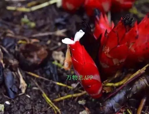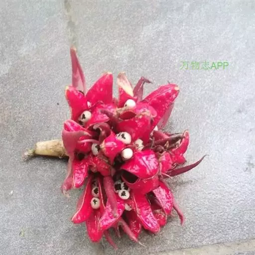 总花梗长1-5-2厘米(或有时更长),被2-3枚鳞片;花序近卵形,苞片红色,宽卵形或椭圆形,长3.5-5厘米,被疏柔毛;花萼长5厘米,膜质;花冠管白色,长4-6厘米,裂片长圆状披针形,长3-3.5厘米,白色或稍带黄色,有紫褐色条纹;唇瓣倒卵形,长3厘米,宽2.6厘米,浅紫色,侧裂片长约5毫米;花丝极短,花药室披针形,长1.5厘米,药隔附属体喙状,长1.5厘米。蒴果长3.5厘米,熟时开裂成3瓣,内果皮红色;种子黑色,被白色假种皮。花期:7-9月;果期:9-11月。 [3-4]