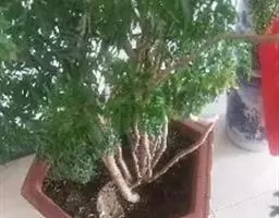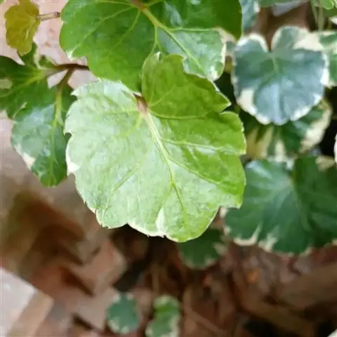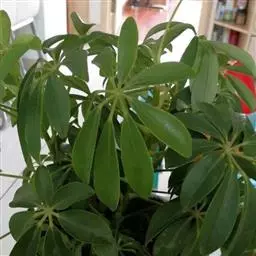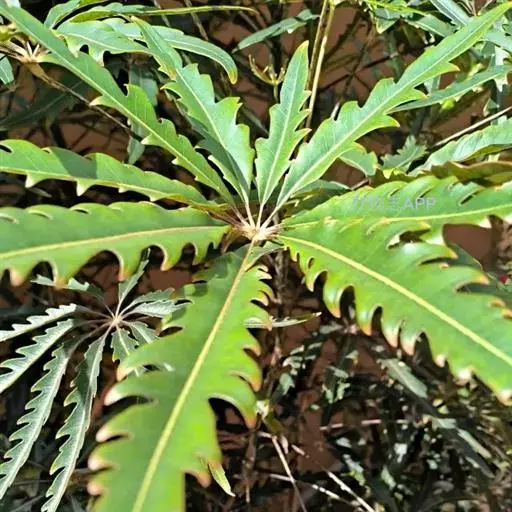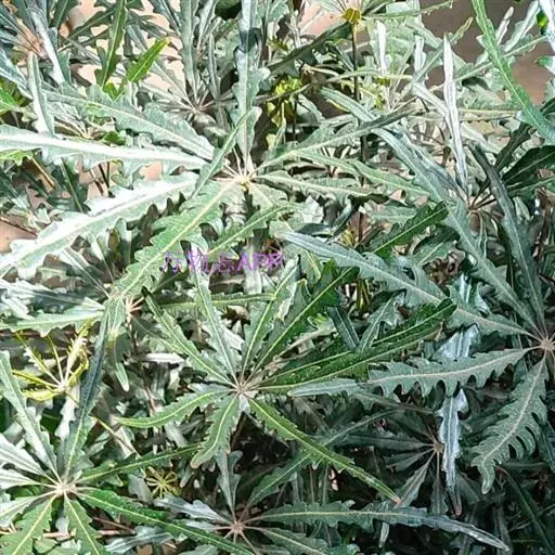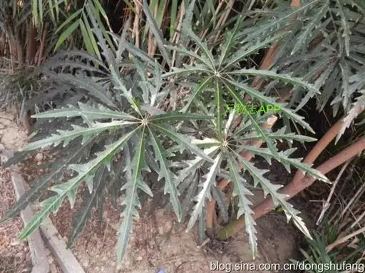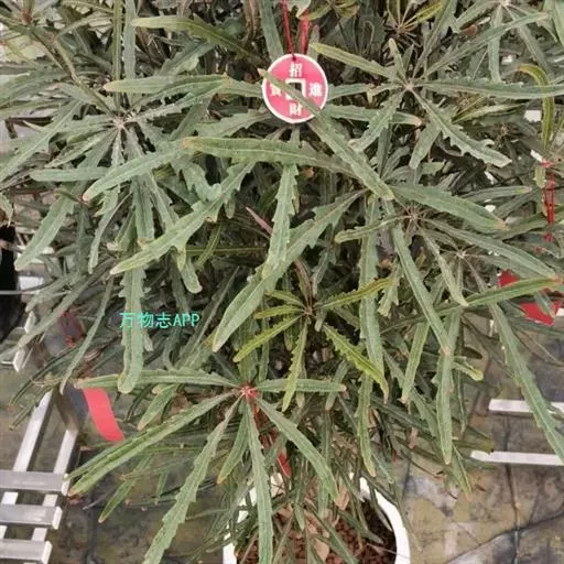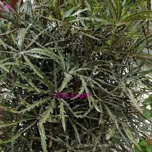⑵狭叶孔雀木:又称维奇氏假惚木、手树,掌状复叶,形似手掌,小叶窄长,灰绿色,小叶周边深红色,中肋粉红色。