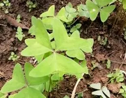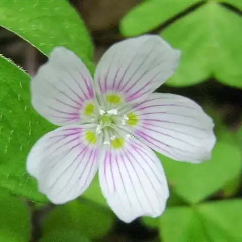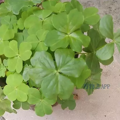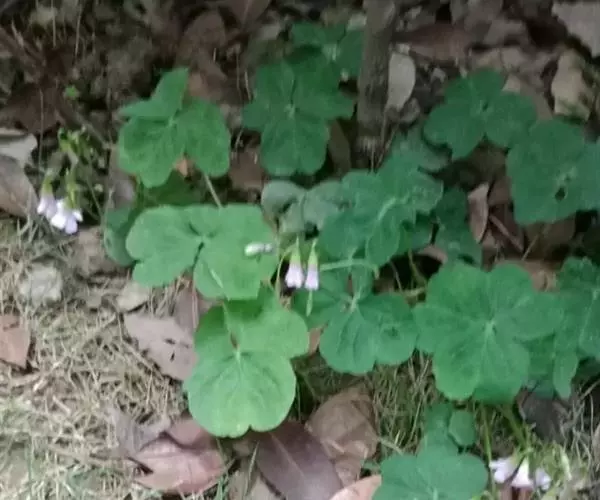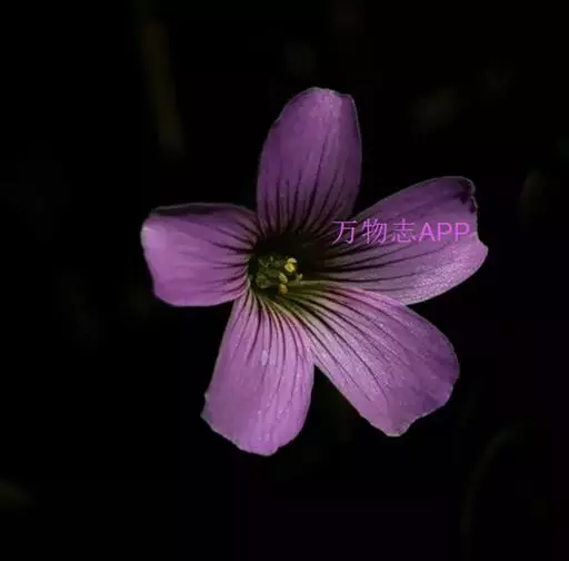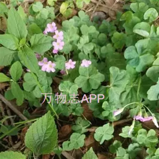叶基生;叶柄长5-30厘米或更长,被毛;小叶3,扁圆状倒心形,长1-4厘米,宽1.5-6厘米,顶端凹入,两侧角圆形,基部宽楔形,表面绿色,被毛或近无毛;背面浅绿色,通常两面或有时仅边缘有干后呈棕黑色的小腺体,背面尤甚并被疏毛;托叶长圆形,顶部狭尖,与叶柄基部合生。总花梗基生,二歧聚伞花序,通常排列成伞形花序式,总花梗长10-40厘米或更长,被毛;花梗、苞片、萼片均被毛;花梗长5-25毫米,每花梗有披针形干膜质苞片2枚;萼片5,披针形,长约4-7毫米,先端有暗红色长圆形的小腺体2枚,顶部腹面被疏柔毛;花瓣5,倒心形,长1.5-2厘米,为萼长的2-4倍,淡紫色至紫红色,基部颜色较深;雄蕊10枚,长的5枚超出花柱,另5枚长至子房中部,