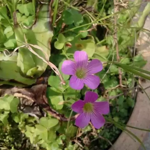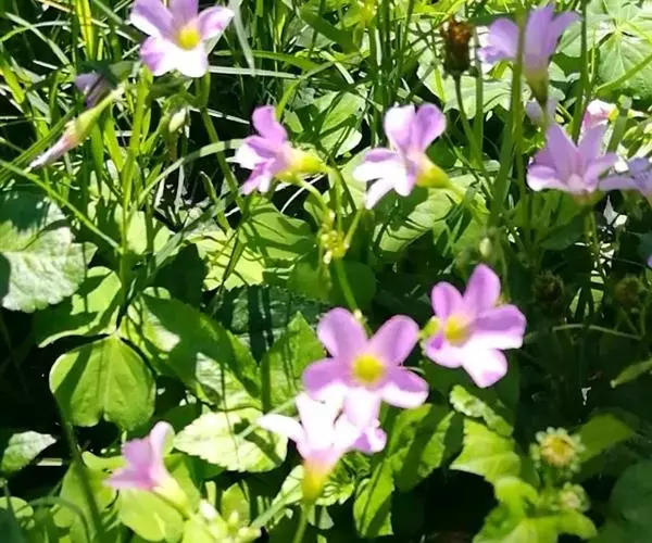 红花酢浆草(学名:Oxalis corymbosa DC.)是酢浆草科,酢浆草属多年生直立草本植物。无地上茎,地下球状鳞茎,鳞片膜质,褐色,叶基生;叶柄被毛;小叶片扁圆状倒心形,顶端凹入,两侧角圆形,背面浅绿色,托叶长圆形,顶部狭尖。总花梗基生,二歧聚伞花序,花梗、苞片、萼片均被毛;萼片披针形,花瓣倒心形,淡紫色至紫红色,花丝被长柔毛;花柱被锈色长柔毛,3-12月开花结果。
