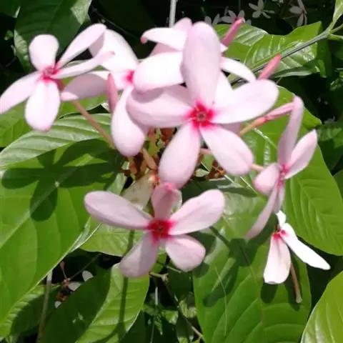 聚繖花序,顶生,长 16-32 公分,宽 10-15 公分,无毛;总花梗 3 歧,长 13-28 公分,肉质,绿色,被短柔毛,老时逐渐脱落;花梗长约 2 公分,澹红色,被短柔毛或毛脱落;苞片通常大形,开花前脱落;花萼小,5 裂,裂片阔圆形,长、宽各约 1.5 公釐,顶端圆,不张开而紧压花冠筒,内面基部无腺体;花冠漏斗状,直径 4-5 公分,纯白色,喉部黄色,具芳香;花冠裂片 5 枚,狭倒卵圆形或椭圆形,比花冠筒长约 1 倍,长 3.5-4.5 公分,宽 1.5-1.8 公分,顶端圆,基部向左覆盖;花冠筒圆筒形,长 1.5-1.7 公分,直径约 3 公分,外面无毛,内面密被柔毛,喉部无鳞片;雄蕊 5 枚,着生于花冠筒基部,花丝极短,花药长圆形,长约 3 公分,钝头,基部圆,内藏,与柱头分离;花柱短,柱头长圆形,中间缢缩,顶端 2 浅裂;子房由 2 枚离生心皮组成,无毛,每心皮有胚珠多颗,着生于子房腹缝线的胎座上;无花盘。