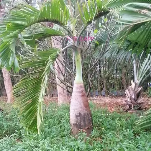 单干,树干短,肥似酒瓶,树高可达3米以上,胸径达38-60厘米。羽状复叶,叶长1.8-2.2米,小叶披针形,长约45厘米,宽3.8-5厘米,40-60对,中脉和侧脉凸起。叶柄长30-45厘米,淡红色,没有黄色的条纹。呈弓形后弯,叶鞘圆筒形。小苗时叶柄及叶面均带淡红褐色。雌雄同株,花柄长60厘米,佛焰苞柔软,长60厘米。果长3厘米,宽2.5厘米,表面粗糙,形状不规则,种子小而扁平。呈球状,长约1.3厘米。