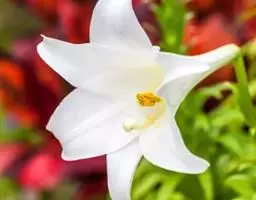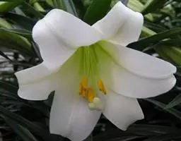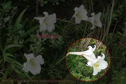麝香百合(学名:Lilium longiflorum Thunb.):在中国台湾亦称铁炮百合。鳞茎球形或近球形,高2.5-5厘米;鳞片白色。茎高45-90厘米,绿色,基部为淡红色。叶散生,披针形或矩圆状披针形,两面无毛。花单生或2-3朵;花喇叭形,白色,筒外略带绿色。蒴果矩圆形,长5-7厘米。花期6-7月,果期8-9月。