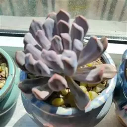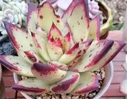 紫珍珠是景天科石莲花属的多年生肉质草本植物。植株中小型;叶片肉质,匙形,呈莲座状紧密排列;叶片粉紫色,…