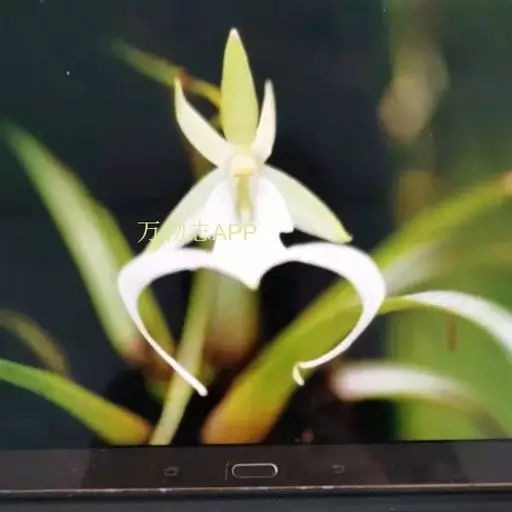 总状花序长约1厘米,具2-3 (-5) 朵花;花苞片卵状披针形,长7-9毫米,先端渐尖;花梗和子房长2.8-5厘米,具5条肋;花白色,芳香;中萼片近倒卵形,长8-10毫米,宽2.5-4毫米,先端钝,具3条脉;侧萼片向前叉开,与中萼片相似而等大,上半部向外弯,背面中肋近先端处龙骨状隆起;