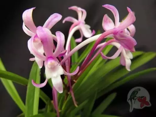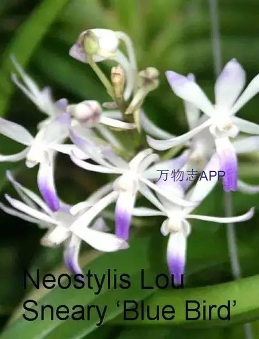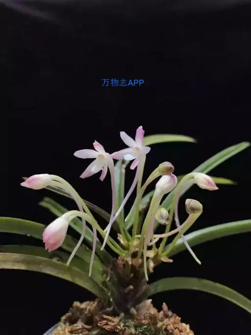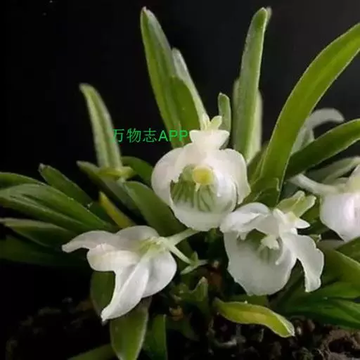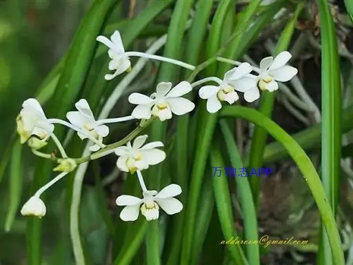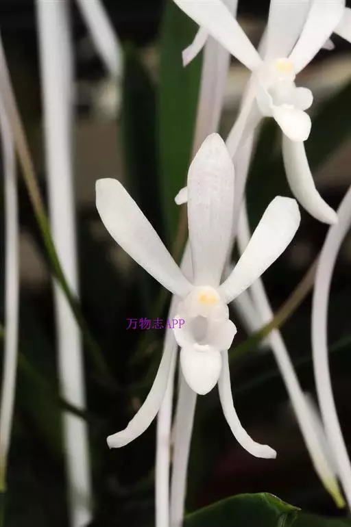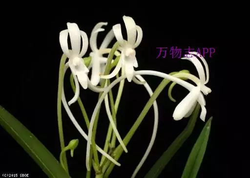 风兰(学名:Neofinetia falcata (Thunb. ex A. Murray) H. H. Hu):植株高8-10厘米。茎长1-4厘米,稍扁,被叶鞘所包。叶厚革质,狭长圆状镰刀形。总状花序长约1厘米,具2-5朵花;花白色,芳香;花瓣倒披针形或近匙形,长8-10毫米,宽2.2-3毫米,先端钝,具3条脉;唇瓣肉质,3裂。花期4月。