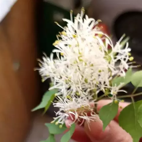 花杂性,密集簇生于去年生枝上,呈甚短的聚伞圆锥花序,长约1.5厘米;两性花花萼钟状,雄蕊2,花药长1.5-2毫米,花丝较长,长5.5-6毫米,雌蕊具长花柱,柱头2裂。翅果匙形,长4-5厘米,宽5-8毫米,中上部最宽,先端急尖。花期2-3月,果期9月。