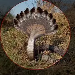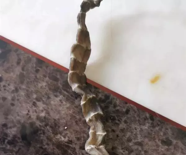 性状鉴别,本品呈圆盘形,盘径14—20cm,头居中,椭圆形,黑褐色,鼻尖向前不上翘,通体具23—33对黄黑相间的色环,黄黑等宽,体背有明显脊棱,脊棱鳞片扩大呈六边形,尾短末端钝圆。质坚韧。气腥,味咸。背鳞鳞片椭圆形,长6.5—7.0mm,宽4.5—5.0mm,黄褐色,上半部边缘整齐,具8—13个小孔,无中肋,无端窝,表面平滑,透明。背棱脊处鳞片扩大呈六边形,有孔30—34个,不规则分布于鳞片上半部,也无中肋,无端窝。质韧,不易折断。气微,味淡。