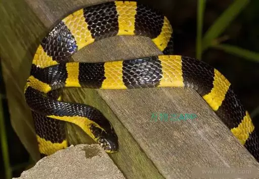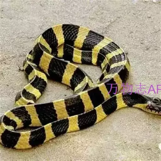 金环蛇全长983—1,500mm,具有前沟牙。头呈椭圆形,尾极短, 图2:金环蛇 尾略呈三棱形,尾末端钝圆而略扁,通身呈黑色与黄色相间的少数明显的棱骨,黑色环纹和黄色环纹几乎等宽,黄色环纹在体部有20—28环,黑色环纹20—26+3—5。在尾部有3—5环,背鳞平滑共15行,背中央的1行鳞片特别大,肛磷完整,尾下鳞片为单行,腹部为灰白色。头背黑褐色,枕及颈部有污黄色的“∧”形斑。背脊隆起呈脊,所以躯干横切面略呈三角形,尾末端圆钝。头椭圆形,与颈区分较不明显,头背具有典型的9枚大鳞片,背鳞平滑,全身15行,背正中一行脊鳞扩大呈六角形。
