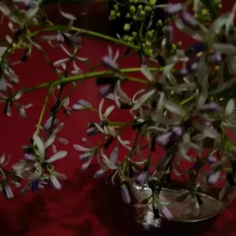 圆锥花序约与叶等长,无毛或幼时被鳞片状短柔毛;花芳香;花萼5深裂,裂片卵形或长圆状卵形,先端急尖,外面被微柔毛;花瓣淡紫色,倒卵状匙形,长约1厘米,两面均被微柔毛,通常外面较密;雄蕊管紫色,无毛或近无毛,长7-8毫米,有纵细脉,管口有钻形、2-3齿裂的狭裂片10枚,花药10枚,着生于裂片内侧,且与裂片互生,长椭圆形,顶端微凸尖;子房近球形,5-6室,无毛,每室有胚珠2颗,花柱细长,柱头头状,顶端具5齿,不伸出雄蕊管。