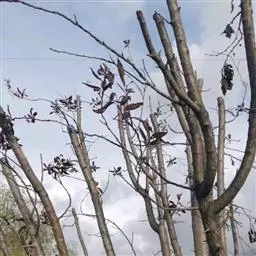 2月下旬或3月上旬选取直径为0.5厘米的苗根或枝条,剪成长15厘米的插条后再进行扦插。插条上口平截,下口斜截。扦插株距为15-20厘米、行距为30-40厘米,深度为长度的1/3,扦插后将周围土壤按实。4月上旬,插穗上的不定芽相继萌发出土。当苗长到5-8厘米时,只保留1个萌蘖,培养成苗干,其余的萌蘖抹去。