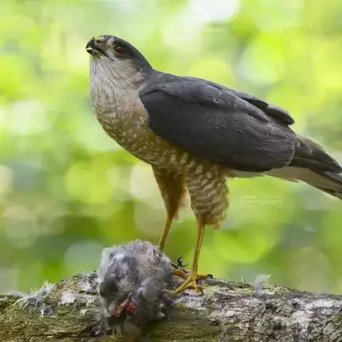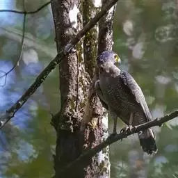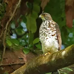 松雀鹰(学名:Accipiter virgatus)小型猛禽,体长28~38厘米。雄鸟上体黑灰色,喉白色,喉中央有一条宽阔而粗著的黑色中央纹,其余下体白色或灰白色,具褐色或棕红色斑,尾具4道暗色横斑。雌鸟个体较大,上体暗褐色,下体白色具暗褐色或赤棕褐色横斑。