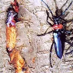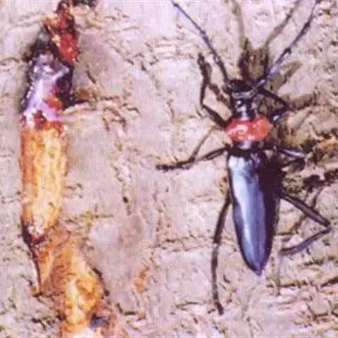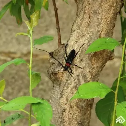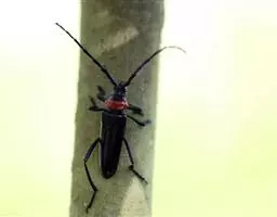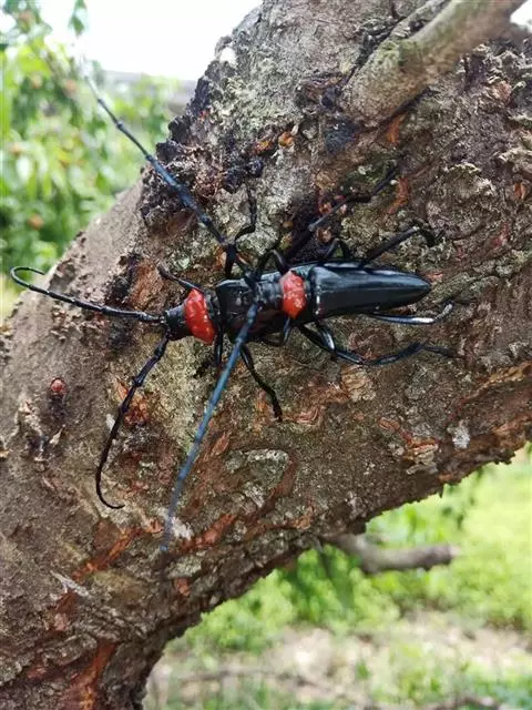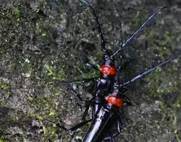 桃红颈天牛是天牛科、颈天牛属昆虫。体黑色发亮,前胸背面大部分为光亮的棕红色或完全黑色。头黑色,…