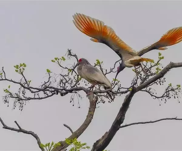 春季是朱鹮的繁殖季节,这时成年的雄鸟和雌鸟结成配偶,离开越冬时组成的群体,分散在栓皮栎树等高大的乔木树上去筑巢、产卵。这时它会用嘴不断地啄取从颈部的肌肉中分泌出来的一种灰色的色素,涂抹到羽毛上,使它的头部、颈部、上背和两翅等都变成灰黑色。