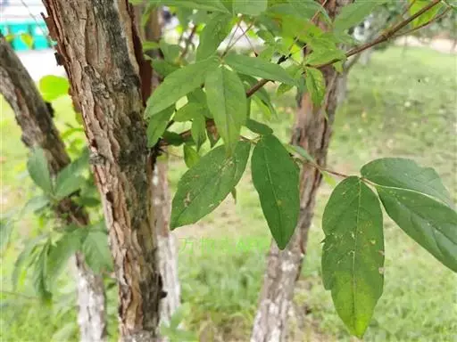 落叶乔木,高20-25米。树皮褐色,常成薄片脱落。小枝圆柱形,有圆形或卵形皮孔;当年生枝紫色或淡紫色,嫩时有稀疏的疏柔毛,多年生枝淡紫褐色。冬芽细小,鳞片边缘纤毛状,覆瓦状排列。覆叶由3小叶组成,小叶纸质,长圆卵形或长圆披针形,稀长圆倒卵形,长7-9厘米,宽2.5-3.5厘米,先端锐尖,边缘在中段以上有2-3个粗的钝锯齿,稀全缘;顶生小叶的基部楔形或阔楔形,小叶柄长5-7毫米;侧生小叶基部倾斜或钝形,小叶柄长1-2毫米;上面绿色,嫩时除沿叶脉有很稀疏的疏柔毛外,其余部分无毛;下面淡绿色,略有白粉,沿叶脉有白色疏柔毛;中肋在上面稍凹下,在下面凸起;侧脉11-13对,在下面显著;叶柄细瘦,淡紫色,长5-7厘米,近于无毛。