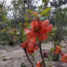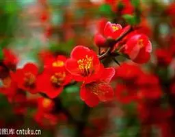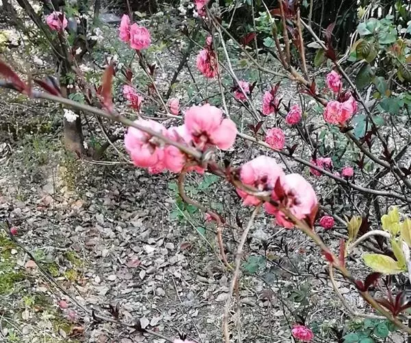 花单生或两朵生于叶腋,先于叶开放,直径2.5-3.5厘米。花梗极短或几无梗;萼筒钟形,被短柔毛,稀几无毛,绿色而具红色斑点;萼片卵形至长圆形,顶端圆钝,外被短柔毛;花有单瓣、半重瓣和重瓣,花瓣长圆状椭圆形至宽倒卵形,花色有白、粉红、红和红白相间等色。雄蕊约20-30,花药绯红色;花柱几与雄蕊等长或稍短;子房被短柔毛。春季先叶或与叶同时开放。 [2-3]