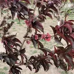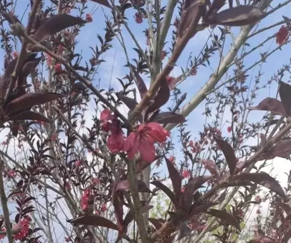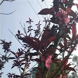 重瓣花朵,叶子紫。喜欢温暖向阳的环境,株高3-5米,灰褐色树皮,红褐色小枝,鲜红色幼叶,紫红色叶片,桃红色花瓣。先开花后生叶,很是可爱养眼,很适合观赏种植。