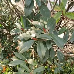 单叶互生,椭圆状或披针形,长7-15厘米,宽2-3.5厘米,先端渐尖,基部宽楔形,上面无毛,下面在脉腋间具少数短柔毛或无毛,叶边具细锯齿,齿端具腺体或无腺体;叶柄粗壮,长1-2厘米,常具1至数枚腺体,有时无腺体。 [2-3]