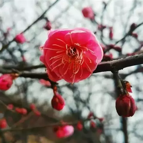 朱砂梅,俗称骨里红,为真梅系直脚梅类,枝条直伸或斜展,不下垂成拱形也不弯曲。属蔷薇科李属植物,…