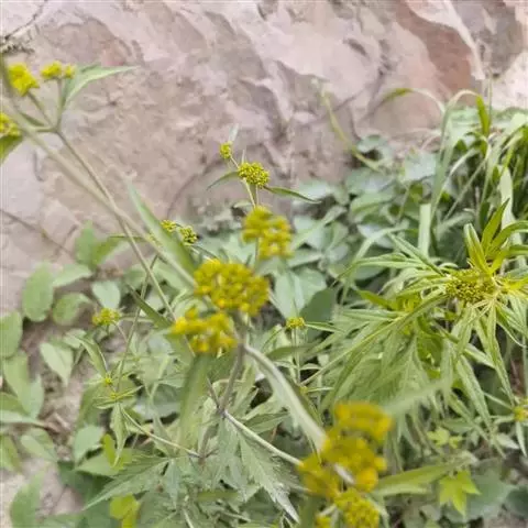糙叶败酱( Patrinia rupestris Juss.subsp.scabra H.J.Wang),败酱科植物,多年生草本,茎丛生,茎上部多分枝,叶对生,裂片倒披针形、狭披针形或长圆形,聚伞花序顶生,呈伞房状排列,花小,黄色,花冠合瓣,果实翅状,卵形或近圆形,种子位于中央。