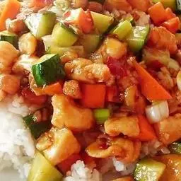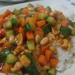 宫保鸡丁盖饭是一道简单的家常饭,主料是鸡胸肉、青笋、胡萝卜、大蒜、葱、干辣椒、盐、味精、胡椒粉、糖、醋、老抽、料酒、淀粉,热白饭一碗。