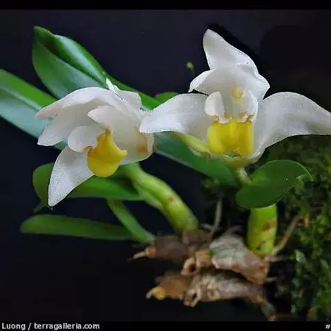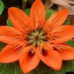 总状花序可具多达9朵花,少有花单生;苞片宽卵形,长3-3.5厘米,宽1.5-2厘米,先端急尖,基部渐狭;花梗长(3-)7-8厘米;花被片反卷,黄色或黄红色,有紫红色斑点,长6-6.5厘米,宽9-11毫米,全缘,蜜腺两边具多数流苏状突起;雄蕊四面张开;花丝长约6-6.5厘米,无毛,花药长1.2-1.4厘米;子房圆柱形,长1.5-2厘米,宽约2毫米;花柱长4-4.5厘米,柱头稍膨大。蒴果长矩圆形,长5.5-6.5厘米,宽1.4-1.8厘米,棕绿色。