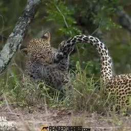 与大多数的猫科动物一样!,母豹的发情行为主要表现在食欲减退、在地上打滚、尾巴抬起用阴门对准公豹身体、摩擦与公豹相邻的铁丝网等行为。 出现这种行为基本可以合笼交配,交配次数以每天3-4次为佳。交配时尽量避免人为干扰,这种干扰可表现在许多方面,如游客的围观,饲养人员的饲养操作,相邻动物的干扰等等。干扰是影响交配能否成功的最主要因素,在这一点上我们是花了将近一年的时间才得出这个结论的,而且还发现为防止公母豹交配时发生打斗而采取的必要的防备措施可能也会影响到交配,有时甚至正是这些防备措施引发了公母豹的打斗。但是我们相信只要防备措施得当以及平时注意培养公母豹的感情,这个问题是可以避免的。