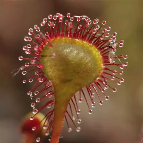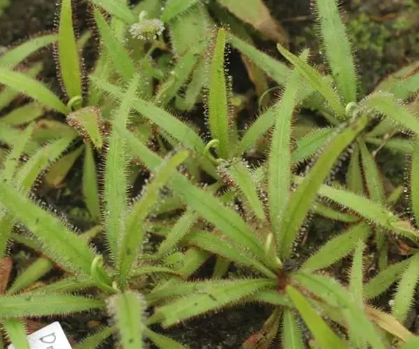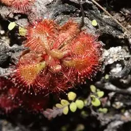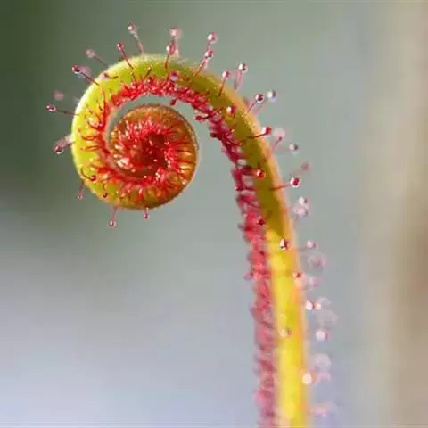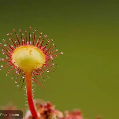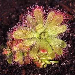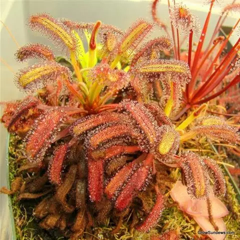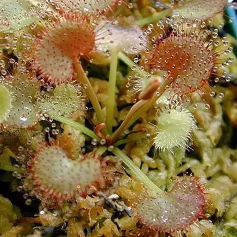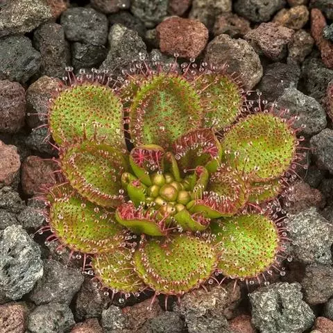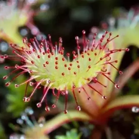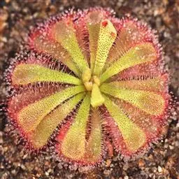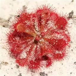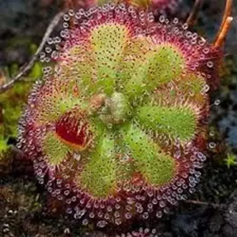 阿帝露茅膏菜 草本,通常多年生,直径2-20厘米;根状茎短,具不定根,常具有根功能的退化叶,末端具或不具鳞茎状球茎。叶互生或基生而莲座状密集,被头状粘腺毛,幼叶常拳卷;托叶膜质,常条裂。聚伞花序顶生或腋生,幼时弯卷;花萼5裂,稀4-8裂,基部多少合生,宿存;花瓣5,分离,花时开展,花后聚集扭转,宿存于顶部;雄蕊与花瓣同数,互生;子房上位,1室,侧膜胎座2-5,胚珠多数,稀少数;花柱3-5,稀2-6,呈各式分裂或不裂,宿存。蒴果,室背开裂;种子小,多数,外种皮具网状脉纹。花期4-5月,但有时会在某些环境刺激下在开花,小花红色。