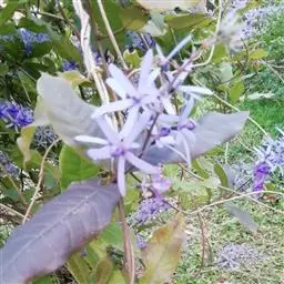 蓝花藤是马鞭草科、蓝花藤属木质藤本,长达5米,叶对生,革质,触之粗糙,椭圆状长圆形或卵状椭圆形,…