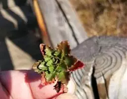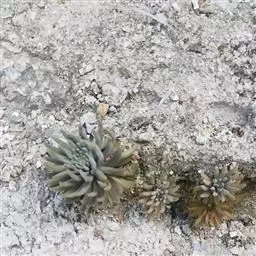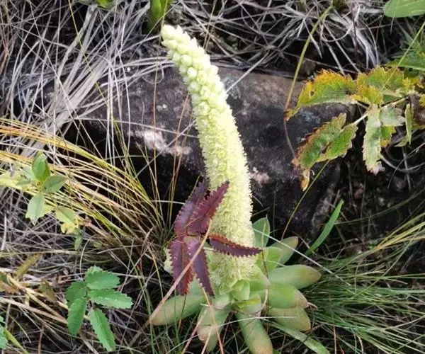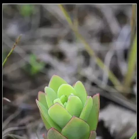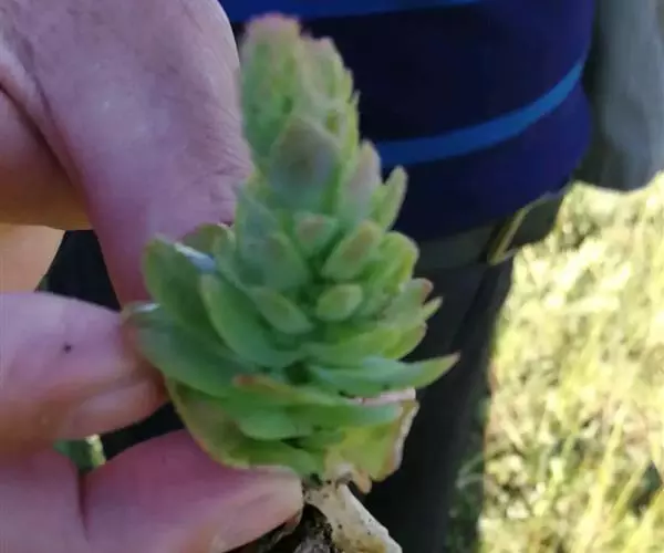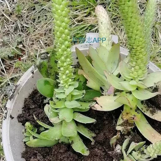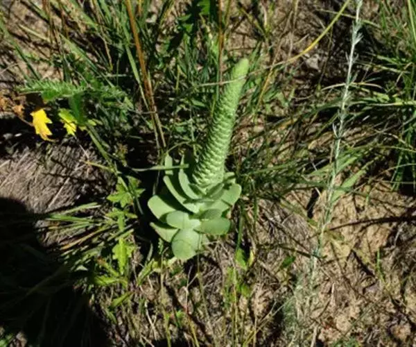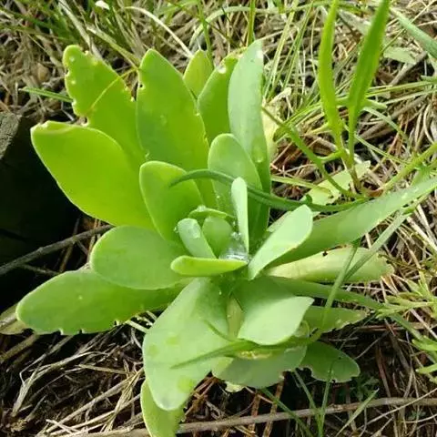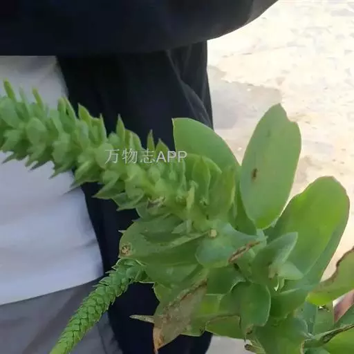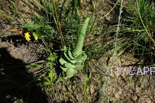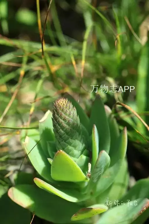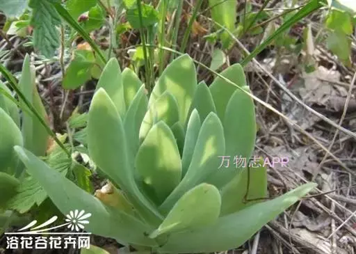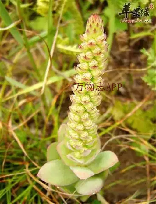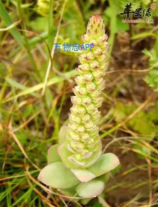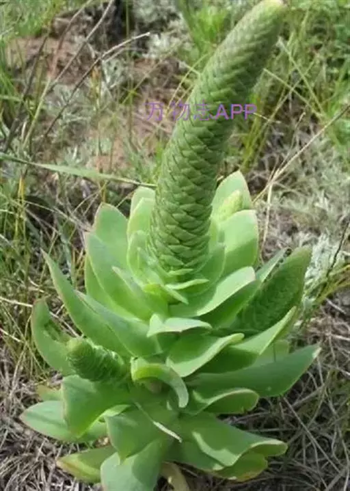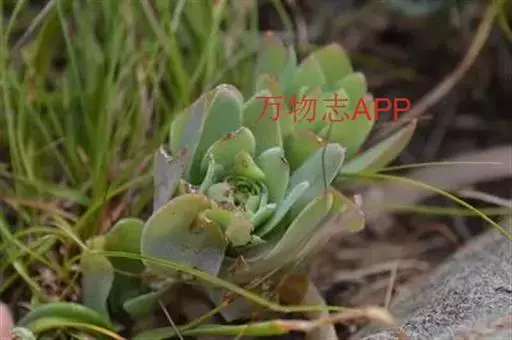 二年生草本。第一年植株有莲座丛;莲座叶先端不具刺,先端钝或短 钝叶瓦松 Orostachys malacophylla (摄影师:薛凯) 渐尖,长圆状披针形、倒卵形、长椭圆形至椭圆形,全缘。