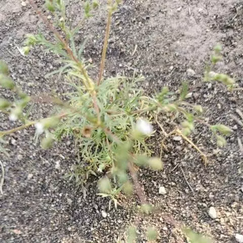 二年生草本或一年生草本,具长柔毛及腺毛;根木质;茎直立或弧曲上升,高20-50cm,单一,少有多茎丛生,基部稍木质化,常在上部分枝。基生叶密生,莲座状,长1-2.5cm,二回羽状三深裂,侧裂片二深裂,中央裂片常三深裂,二回裂片具缺刻或三浅裂,小裂片条形,长1-2mm,先端圆钝,基部楔形,全缘,果期枯萎;叶柄长1-2.5cm;托叶形状似叶,三至多深裂;茎生叶似基生叶,三深裂,近无柄。聚伞花序顶生,具多花,二歧分枝形成圆锥花序,直径1.5-3cm;苞片及小苞片2-3裂,裂片条形;花梗细,长3-6mm;花直径2-3mm;萼筒倒圆锥形或钟形,长1mm,萼片卵状披针形,长1-2mm,先端渐尖;花瓣倒卵形,长2-3mm,白色或粉红色,无毛,先端圆钝,基部有短爪;花丝比花瓣短;心皮10-15,离生,花柱侧基生,子房卵形或长圆形,长1-1.5mm,深褐色,无毛,平滑,先端具尖头。花果期6-8月。