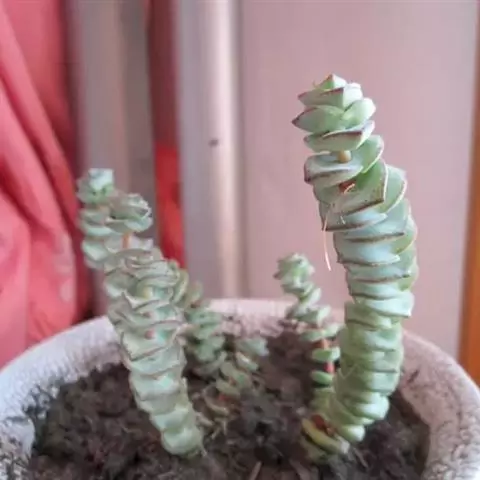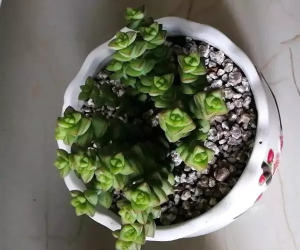叶无柄,对生,密集排列成四列,叶片心形或长三角形,基部大,逐渐变小,顶端最小,接近尖形。叶色浓绿,在冬季和早春的冷凉季节或阳光充足的条件下,叶呈红褐或褐色,叶缘有白色角质层。整个植株叶片排列紧密而整齐,由基部向上逐渐变小,形成宝塔状,是一种奇特而美丽的多肉植物。