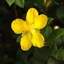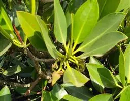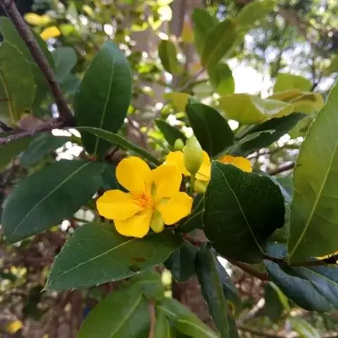 桂叶黄梅(学名:Ochna thomasiana Engl. & Gilg)是金莲木科,金莲木属常绿灌木,株高可达3米,树干修长,树皮褐色,叶互生,近无柄;叶片椭圆形,革质,边缘有针状锯齿,中脉明显。花小,两性,离瓣花;花萼结果时增大,宿存,暗红色;花瓣黄色;雄蕊多数,花丝宿存;子房上位。果皮薄,未成熟时绿色,成熟时黑色,每个果实中有种子1粒,褐色。