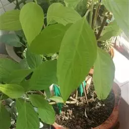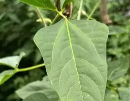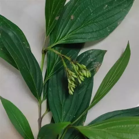 叶对生,薄纸质,多少为长圆卵形,长7-8厘米,宽4-5.5厘米,先端钝尖或渐尖,基部宽楔形或近于圆形,有时两侧稍不对称,上面黄绿色,疏被黄色平贴短柔毛,下面淡白色,密被白色乳头状突起及稀疏的平贴短柔毛,中脉在上面微凹下,下面凸出,侧脉7-8对,在上面稍凹下,下面明显;叶柄纤细,长1.5-2厘米,疏被黄色贴生短柔毛,上面有浅沟,下面圆形。