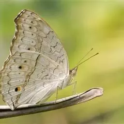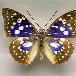 绿豹蛱蝶(雌) 雄蝶的前翅面上,沿1-4的翅脉有香鳞。香鳞会散发出一种吸引雌蝶的气味,也能作为识别的特征。雌蝶很特别的不会在叶子或茎上产卵,反而是在林地地面高1-2米的树皮上产卵。当卵于8月孵化后,毛虫会立即冬眠至春天。醒来后会掉到地上,以紫罗兰为食物。毛虫一般会在晚间觅食,日间会藏身在远离食物的地方,寒冷季节会出来在干叶或枯叶上哂太阳。它们会在地上的植物结蛹,于6月成蝶。