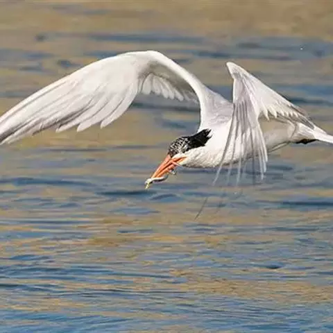 红嘴巨鸥,大型水鸟,体长47~55厘米。夏羽前额、头顶、枕和冠羽黑色。后颈、尾上覆羽和尾白色,…